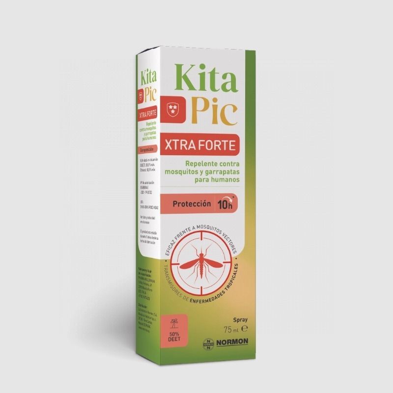 Kitapic xtra forte es un repelente de mosquitos y garrapatas de uso humano formulado con deet 50% recomendado para aquellos que buscan máxima protección en situaciones extremas como en viajes a zonas con riesgo de trasmisión de enfermedadesEficaz frente a mosquitos y garrapatas vectores de enfermedades tropicalesHasta 10 horas contra picaduras de mosquito comunes y el mosquito trasmisor de la malaria, 9 horas contra las picaduras de mosquitos transmisores de la fiebre amarilla y 5 horas contra las picaduras de las garrapatas.